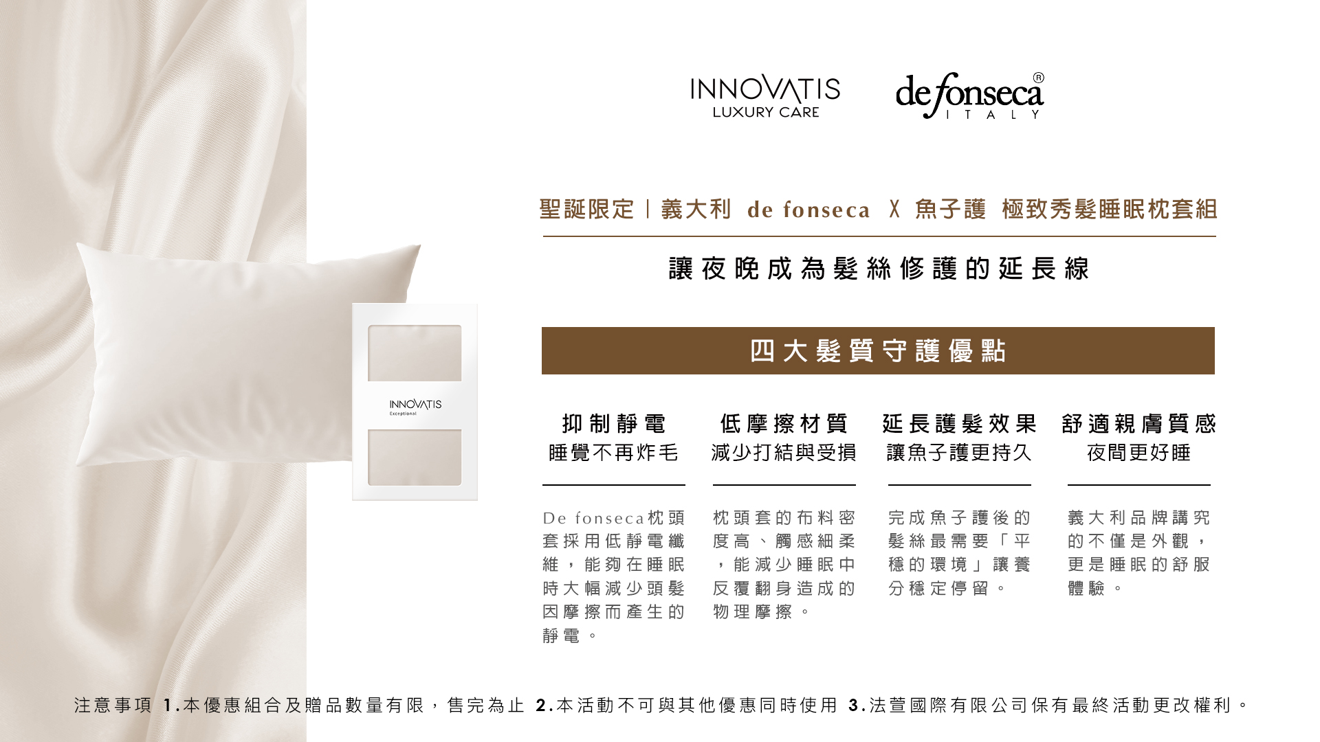 義大利 de fonseca 專業製作,靈感來自愛馬仕級布料工藝,選用低摩擦抗靜電材質,有效減少夜間翻身時對頭髮的拉扯與摩擦,讓護髮成分得以整晚發揮效用,醒來依然柔亮如初。